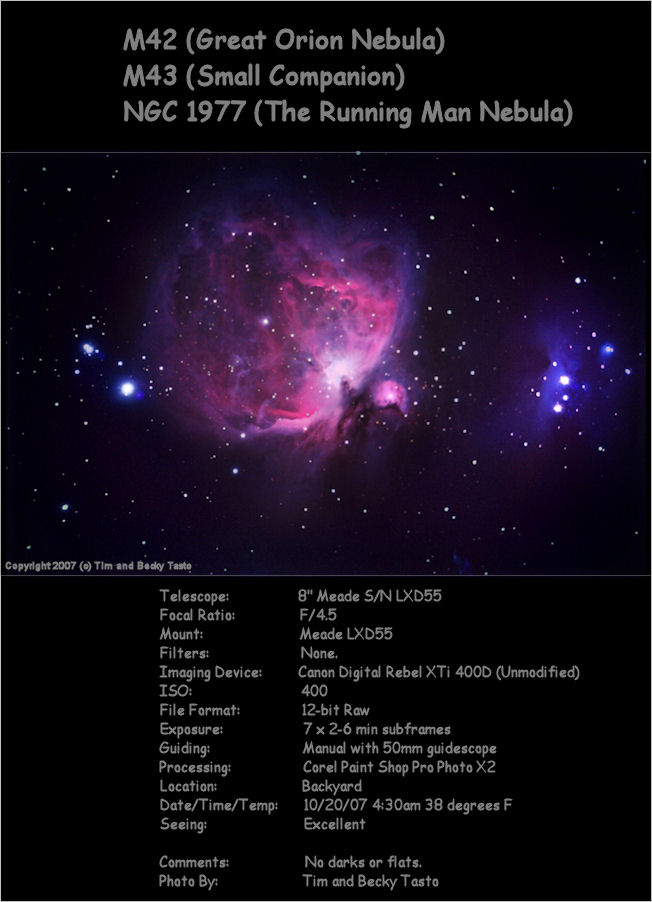 Return to Canon XTi Main Page All images copyright (c) Tim Tasto and Becky Tasto M42 M43 NGC1977 Xti Digital