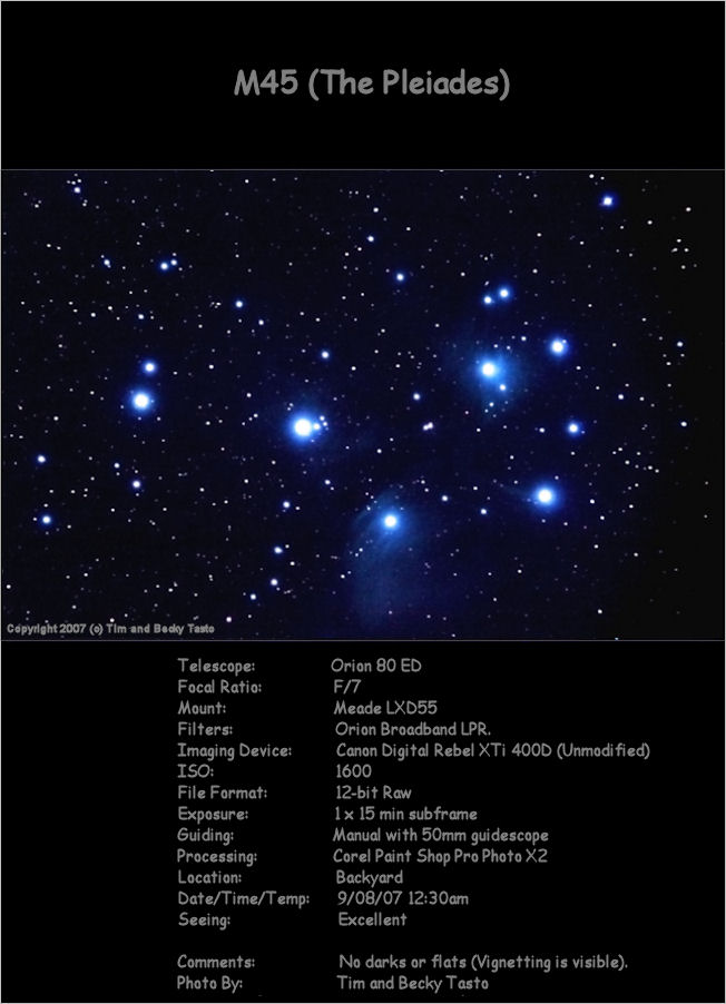 | M45, the Pleiades, with the Canon Digital Rebel XTi (400D) CCD and DSLR Astrophotography by Tim Tasto and Becky Tasto (Please