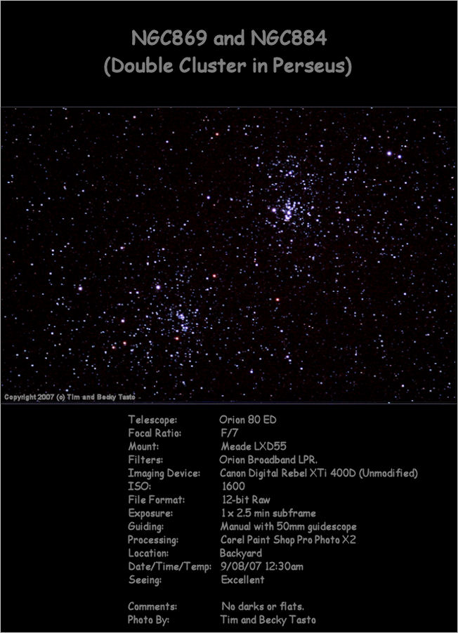 | NGC869 and NGC884, the Double Cluster in Perseus, with the Canon Digital Rebel XTi (400D) CCD and DSLR Astrophotography by Tim Tasto and Becky Tasto (Please
