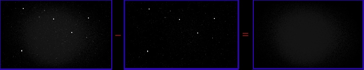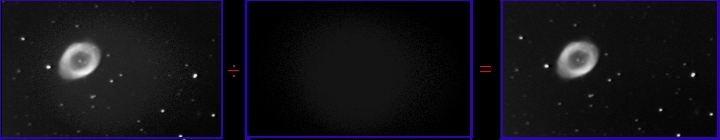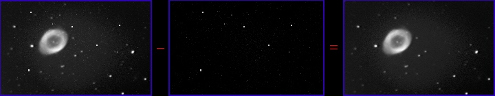 (Adjust brightness and contrast on your monitor for best viewing) This tutorial presents a basic overview of image processing techniques for Deep Space Objects. The tutorial is presented in a very rudimentary fashion to help develop an understanding of basic image processing, which is a combination of art and science. Dark and flat fields should be applied to all images, but what happens beyond that is largely up to the judgement of the person processing the image. When you get past Step 3 of the tutorial, there is no "one correct method" anymore....it's all up to you beyond that point. For this tutorial, I used Version 7 of Stellar Magic and Version 5 of Paint Shop Pro. Paint Shop Pro is a very powerful and inexpensive graphics program and I have linked to the company that sells it on my main page. Stellar Magic may still be available on the internet. One thing that I cannot emphasize enough is that once you complete Step 3 below, make sure you save your image and don't do any further operations on anything but a copy of it. Once you have created the "calibrated image", you don't want to mess with it. Always make a copy at this point and perform any further image processing on the copy. The reason for this is that beyond Step 3, you are in a part of the process that involves a lot of choices and possibilities. If you don't like the results you are getting, you may have to start over and you will need the calibrated image to do so. Image processing involves a series of mathematical techniques that can get you from here:![]() To here: ![]() Let's get started! All CCD imagers generate noise. The SAC-8 has particularly low noise, but often hot pixels show up and require removal. This is the purpose of the dark frame. It will remove hot pixels and noise generated by the CCD chip. The image on the left is the raw "dirty" image containing the effects of CCD chip noise and optical vignetting. Some of those bright white dots are not stars - rather, they are "hot pixels" on the CCD chip. The first step is to remove the chip noise and hot pixels. Subtraction of the dark frame accomplishes this. The image on the far left is a raw frame of M57 out of the SAC-8. The center image is the dark frame. The dark frame subtraction process is illustrated below. ![]() Note that the "hot pixels" are gone following the subtraction of the dark frame. The optical vignetting remains in the resulting image on the right, however. In Step 3, a flat field will be used to remove the vignetting. Step 2: Flat Field Preparation The flat field is used to remove optical effects such as vignetting. The flat field also contains chip noise and a dark frame must also be subtracted from it before it is applied to the image of M57. So, we subtract a dark frame from the raw flat field. The raw and noisy flat field is on the far left. The dark frame is in the center image. The result is shown on the far right. ![]() Step 3: Flat Field Division The flat field is now ready for application to the image of M57. The flat field application shown below is a division operation because optical effects are accumulated in a multiplicative fashion on the CCD chip. Therefore, division is required to remove them (instead of subtraction). The process is illustrated below. ![]() The 3 images above are slightly deceptive in that one step is not shown. When the division of the image by the flat field occurs, the image becomes "scaled" and loses some of it's brightness. I have ommitted the step where the brightness of the image is restored (because it is very simple to brighten it up again). The final image on the right has already been re-brightened and shows the effect of flat field application. Though the image still contains a slight gradient, I am not going to address gradient removal in this basic tutorial. We now have a calibrated image of M57. Chip noise, hot pixels and optical effects have been removed. What happens beyong this point is largely dependent upon the desires of the person processing the image. Some people may wish to stop at this point because the image contains the maximum amount of information. Processing steps beyond this point will result in a loss of information in the image. In the lower right hand corner of the calibrated image above, the small galaxy IC-1296 appears very faintly (you may or may not be able to see it by adjusting your monitor). The processing that follows will result in emphasizing M57, but IC-1296 will be lost. NOTE: Always save the final calibrated image and only process copies of it from this point on. There are many different ways to process an image depending upon the effect you wish to achieve. If you want to start over (or make a mistake), you will need the original calibrated image to do so. The processing that follows presents only one of MANY techniques that can be used. We are now entering the "creative" part of image processing (i.e. the fun part - because the possibilities are almost endless. I am only presenting one of many possible techniques). Step 4: Apply Van Crittert Deconvolution We now enter the part of image processing that is largely up to your own personal taste. This is the more "artistic" part. There are no hard and fast rules beyond this point. It's all up to your own preferences and what you think will produce an aesthetically pleasing image. I have chosen to bring out more detail in M57 by application of Van Crittert deconvolution. I used Stellar Magic to apply 4 iterations of Van Crittert deconvolution with a point spread function (PSF) of 3. I chose Van Crittert because it tends to be a "softer" deconvolution than Richardson-Lucy or Maximum Entropy.The result is shown below. Note that I am presenting a larger image now. It is the full size version of the image that resulted from Step 3 above.
