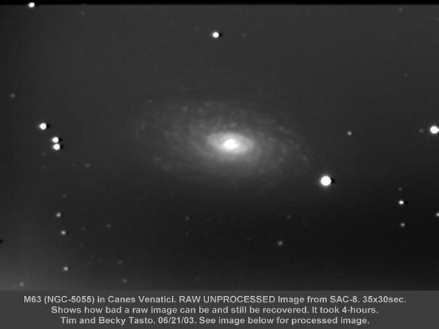 Raw Image Before Processing Final Image After Processing This tutorial only presents a small snapshot of image processing techniques and contains a minimal number of steps. Many more/different things could have been done to the image (i.e. removal of the gradient using more "elegant" techniques than a brute force power law stretch that destroyed background detail, or processing to prevent the stars from turning harsh white, or even preserving IC-1296 while still emphasizing M57). The process up to and including Step 3 is usually imperative. After that, it's really up to you! Hope this helps! Return to Deep Space Imaging and Astrophotography Main Page All images copyright (c) Tim Tasto and Becky Tasto Image Processing